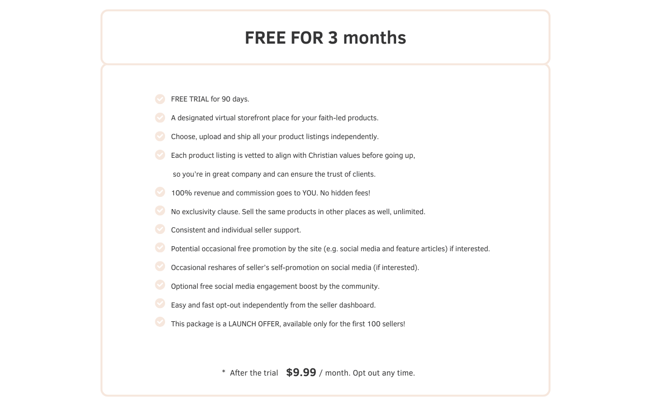 Learn more about the current monthly seller subscription offer and what it entails. This is an exclusive LAUNCH OFFER only for the first 100 eligible sellers who join.