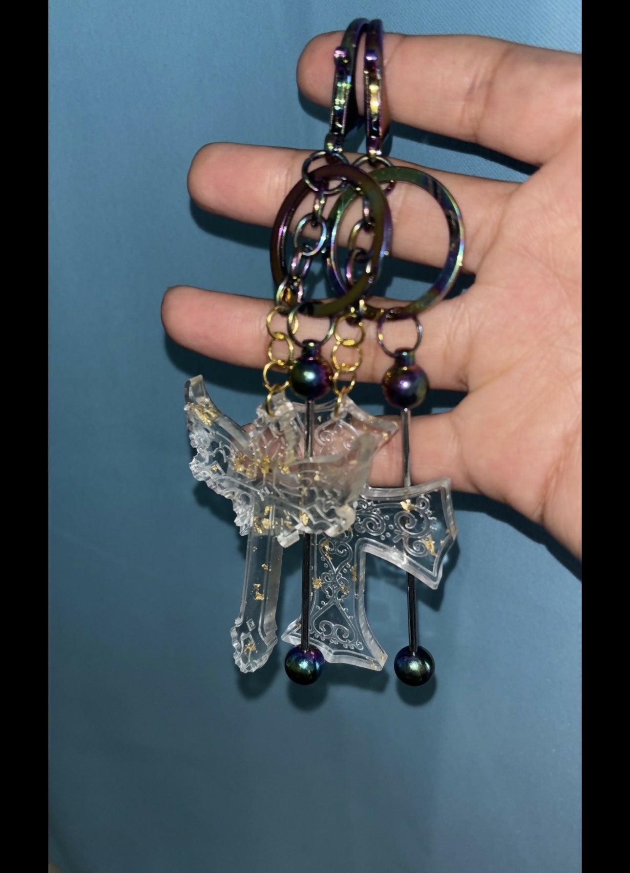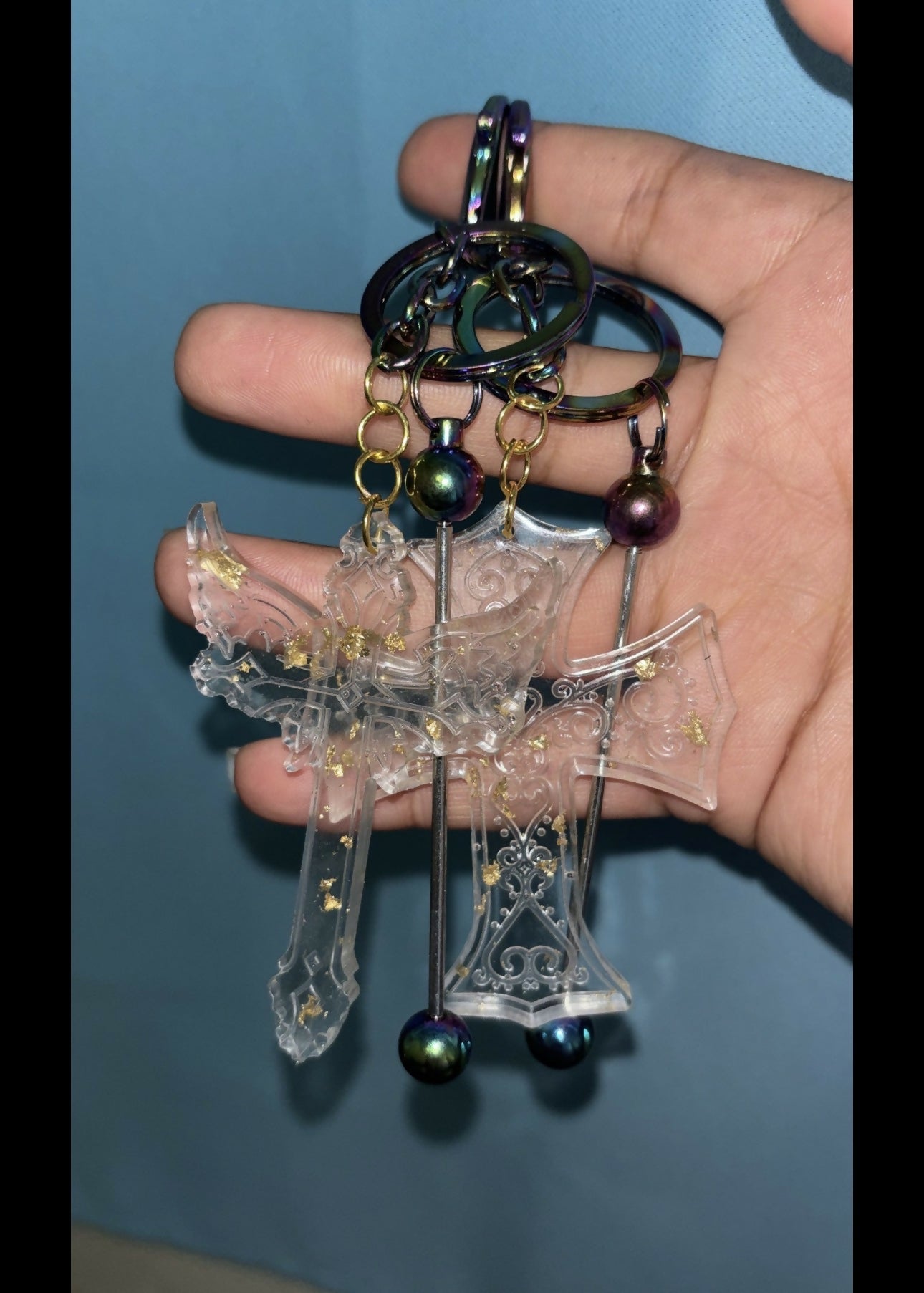 Iridescent keychain with a resin cross charm โจ A little glow to carry your faith everywhere you go.
